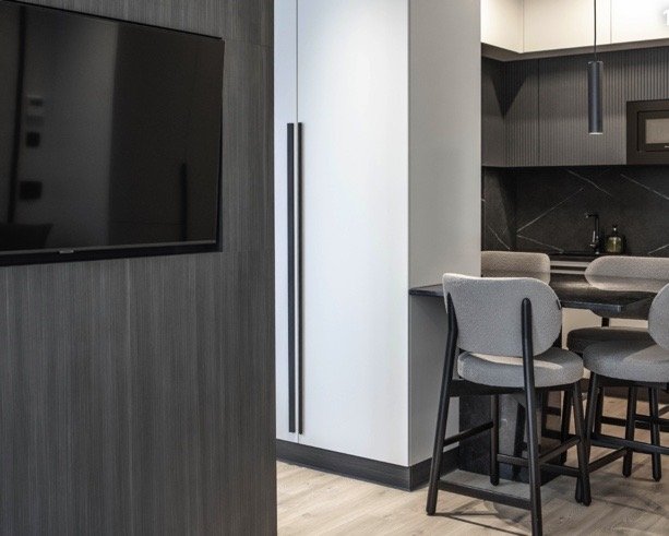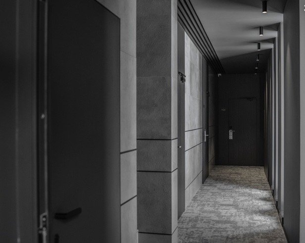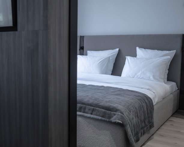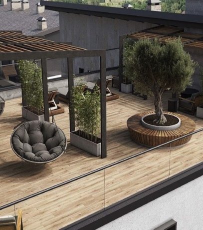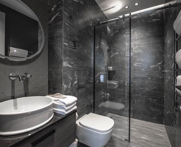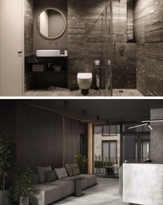Авторская архитектура комплекса и дизайн апартаментов выполнен с использованием только премиальных и натуральных материалов: мрамор, гибкий камень-сланец, металл, сосна.